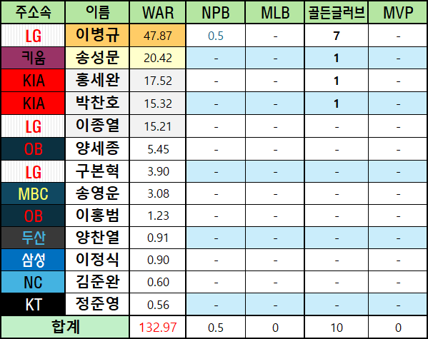 *메이저리그 WAR은 bWAR와 fWAR의 평균값으로 표기했습니다.