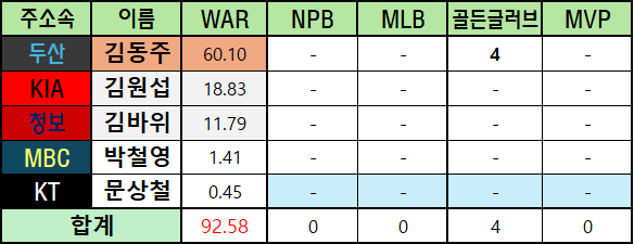 | 주소속 | 이름 | WAR | NPB | MLB | 골든글러브 | MVP |