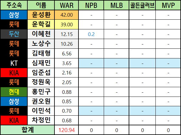 *메이저리그 WAR은 bWAR와 fWAR의 평균값으로 표기했습니다.