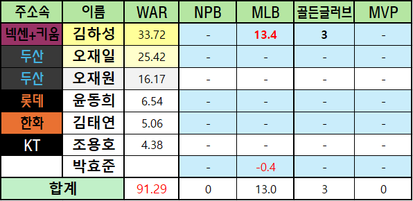 *메이저리그 WAR은 bWAR와 fWAR의 평균값으로 표기했습니다.