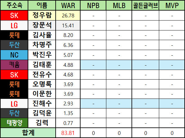 | SK | 정우람 | 26.78 | - | - | - | - |