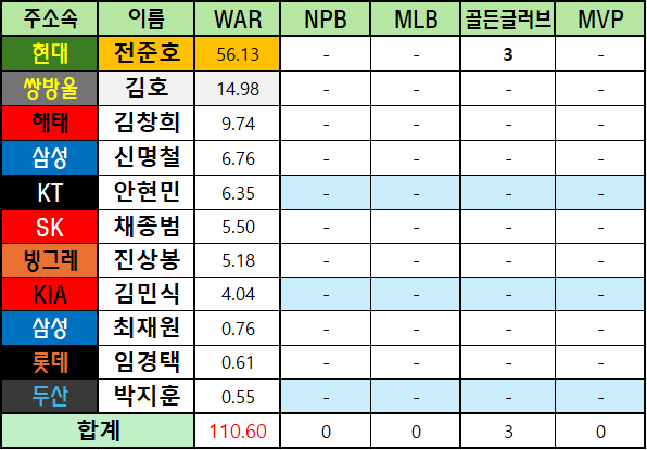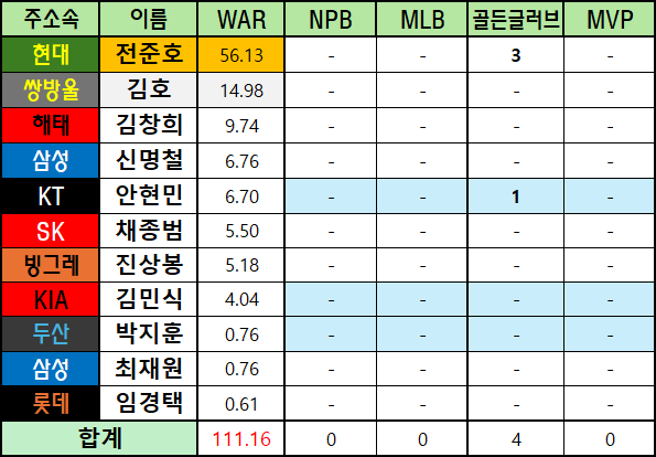 *메이저리그 WAR은 bWAR와 fWAR의 평균값으로 표기했습니다.