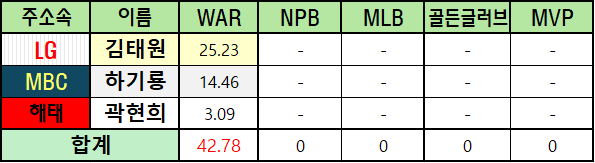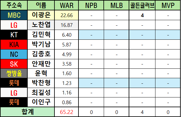 *메이저리그 WAR은 bWAR와 fWAR의 평균값으로 표기했습니다.