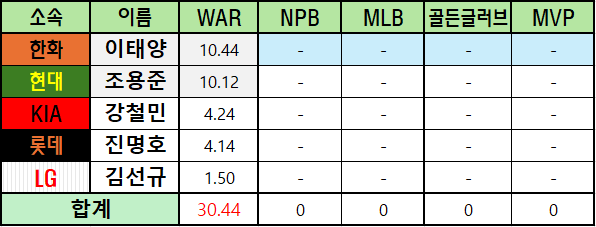 *메이저리그 WAR은 bWAR와 fWAR의 평균값으로 표기했습니다.