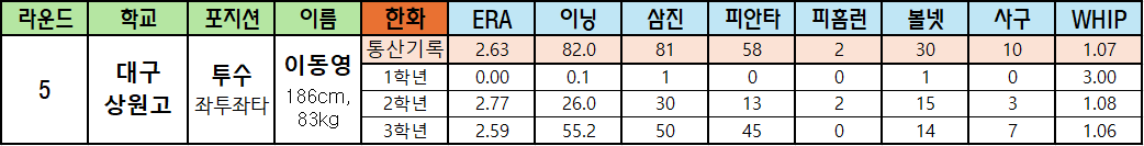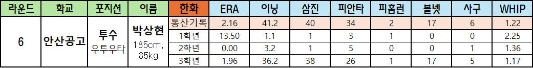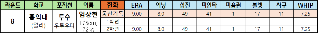 | 라운드 | 학교 | 포지션 | 이름 | 한화 | ERA | 이닝 | 삼진 | 피안타 | 피홈런 | 볼넷 | 사구 | WHIP |