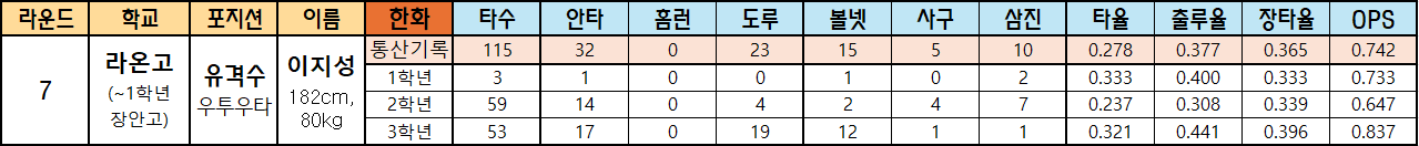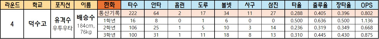 | 라운드 | 학교 | 포지션 | 이름 | 한화 | 타수 | 안타 | 홈런 | 도루 | 볼넷 | 사구 | 삼진 | 타율 | 출루율 | 장타율 | OPS |