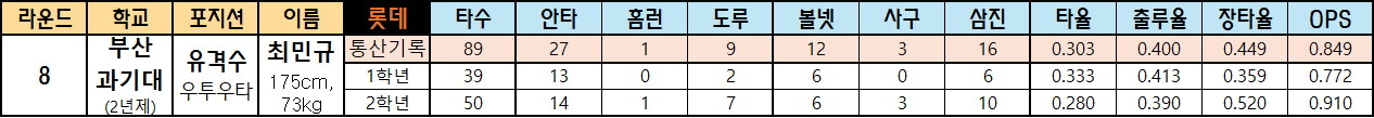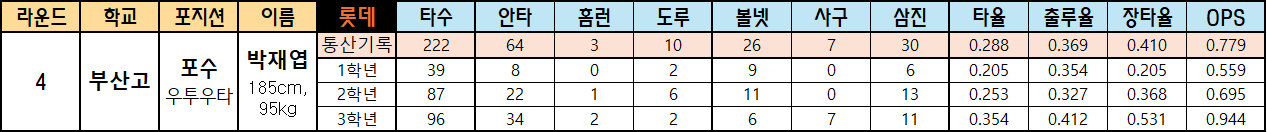 | 라운드 | 학교 | 포지션 | 이름 | 롯데 | 타수 | 안타 | 홈런 | 도루 | 볼넷 | 사구 | 삼진 | 타율 | 출루율 | 장타율 | OPS |