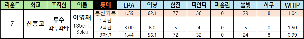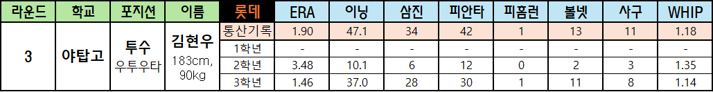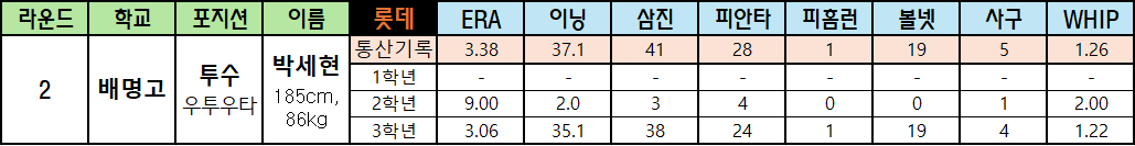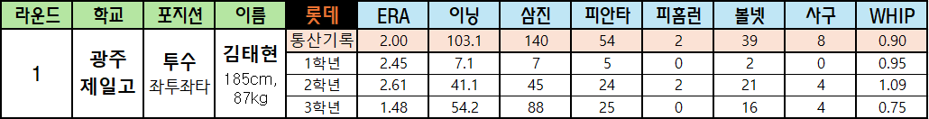 | 라운드 | 학교 | 포지션 | 이름 | 롯데 | ERA | 이닝 | 삼진 | 피안타 | 피홈런 | 볼넷 | 사구 | WHIP |