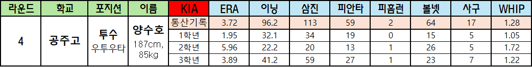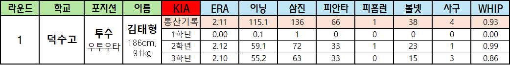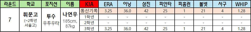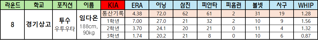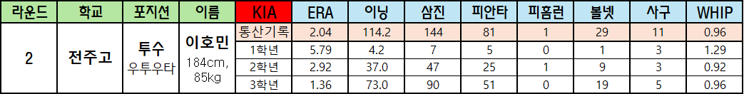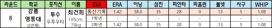 | 라운드 | 학교 | 포지션 | 이름 | KIA | ERA | 이닝 | 삼진 | 피안타 | 피홈런 | 볼넷 | 사구 | WHIP |