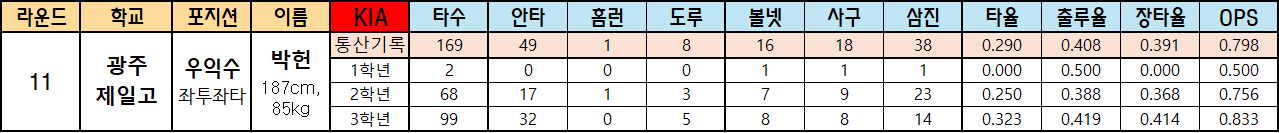 | 라운드 | 학교 | 포지션 | 이름 | KIA | 타수 | 안타 | 홈런 | 도루 | 볼넷 | 사구 | 삼진 | 타율 | 출루율 | 장타율 | OPS |