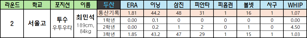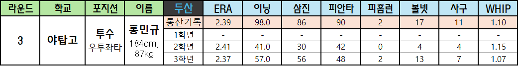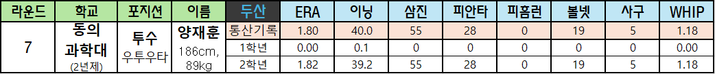 | 라운드 | 학교 | 포지션 | 이름 | 두산 | ERA | 이닝 | 삼진 | 피안타 | 피홈런 | 볼넷 | 사구 | WHIP |