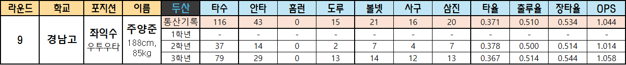 | 라운드 | 학교 | 포지션 | 이름 | 두산 | 타수 | 안타 | 홈런 | 도루 | 볼넷 | 사구 | 삼진 | 타율 | 출루율 | 장타율 | OPS |
