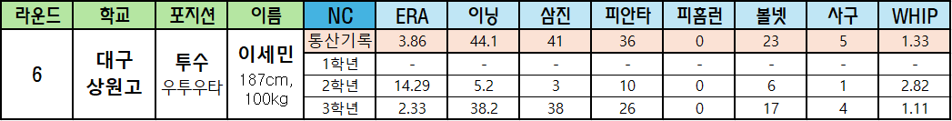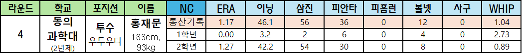 | 라운드 | 학교 | 포지션 | 이름 | NC | ERA | 이닝 | 삼진 | 피안타 | 피홈런 | 볼넷 | 사구 | WHIP |