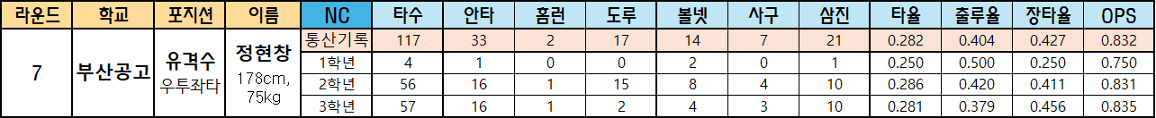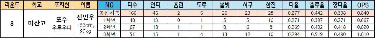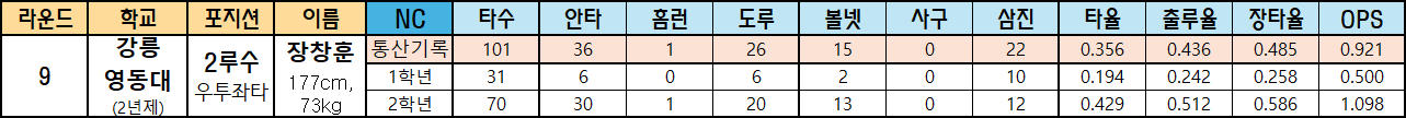 | 라운드 | 학교 | 포지션 | 이름 | NC | 타수 | 안타 | 홈런 | 도루 | 볼넷 | 사구 | 삼진 | 타율 | 출루율 | 장타율 | OPS |