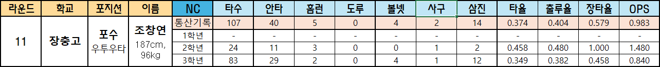 | 11 | 장충고 | 포수 우투우타 |