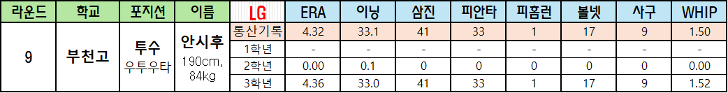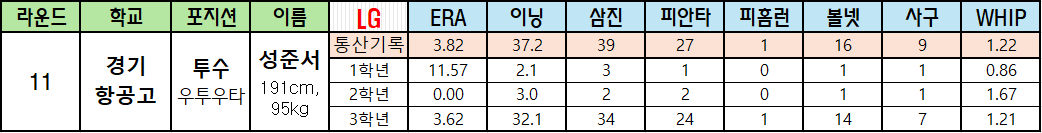 | 라운드 | 학교 | 포지션 | 이름 | LG | ERA | 이닝 | 삼진 | 피안타 | 피홈런 | 볼넷 | 사구 | WHIP |
