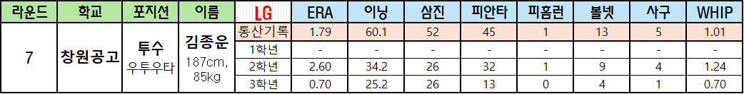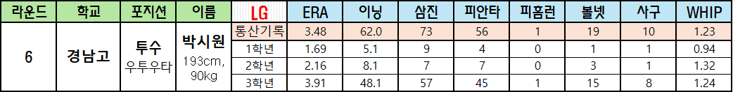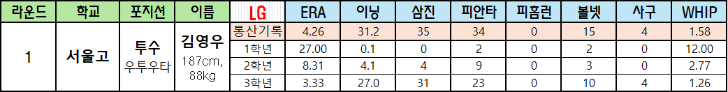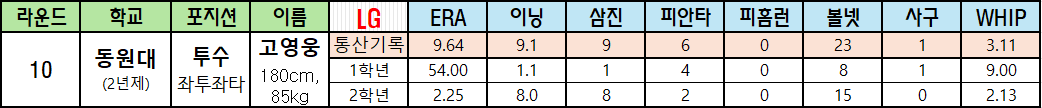 | 라운드 | 학교 | 포지션 | 이름 | LG | ERA | 이닝 | 삼진 | 피안타 | 피홈런 | 볼넷 | 사구 | WHIP |