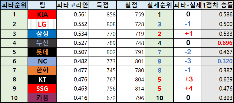 | 피타순위 | 팀 | 피타고리안 | 득점 | 실점 | 실제순위 | 피타-실제 | 1점차 승률 |