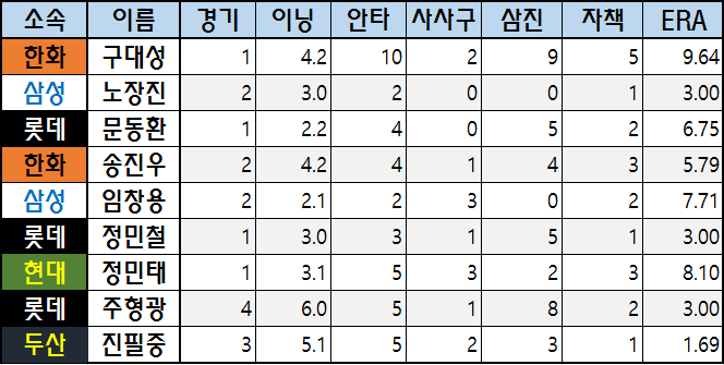 삼성 노장진 2 3.0 2 0 0 1 3.00