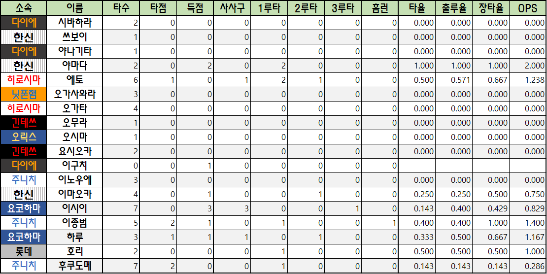 요코하마 하루 3 1 1 1 0 1 0 0 0.333 0.500 0.667 1.167