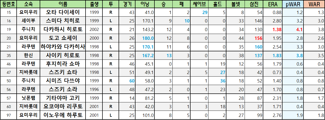 | 등번호 | 소속 | 이름 | 출생 | 투 | 경기 | 이닝 | 승 | 패 | 세이브 | 홀드 | 볼넷 | 삼진 | ERA | pWAR | WAR |