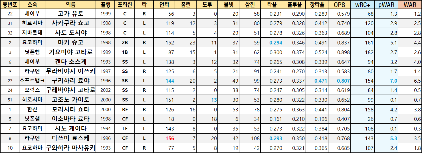 | 등번호 | 소속 | 이름 | 출생 | 포지션 | 타 | 안타 | 홈런 | 도루 | 볼넷 | 삼진 | 타율 | 출루율 | 장타율 | OPS | wRC+ | pWAR | WAR |