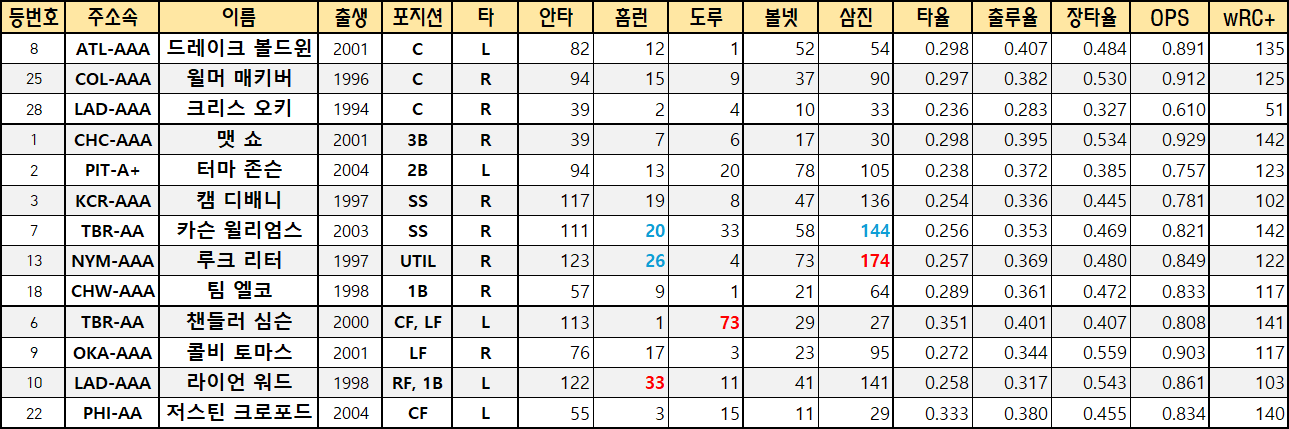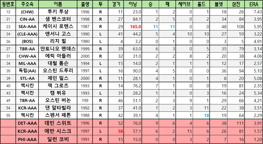 메이저리그와 마이너리그를 오갔던 투상... 그 외에 MLB 유망주 TOP100 중 4위 카슨 윌리엄스, 22위 맷 쇼 등이 보이네요.