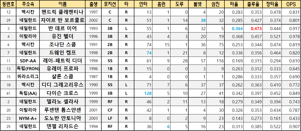 | 25 | 네덜란드 | 덴젤 리차드슨 | 1994 | RF | R | 36 | 6 | 5 | 16 | 23 | 0.313 | 0.385 | 0.522 | 0.907 |