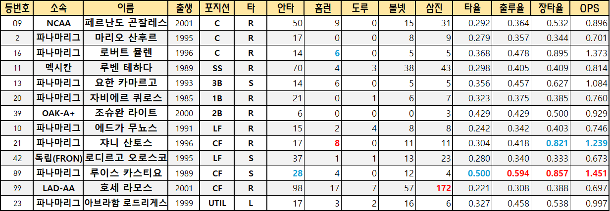 | 등번호 | 소속 | 이름 | 출생 | 포지션 | 타 | 안타 | 홈런 | 도루 | 볼넷 | 삼진 | 타율 | 출루율 | 장타율 | OPS |