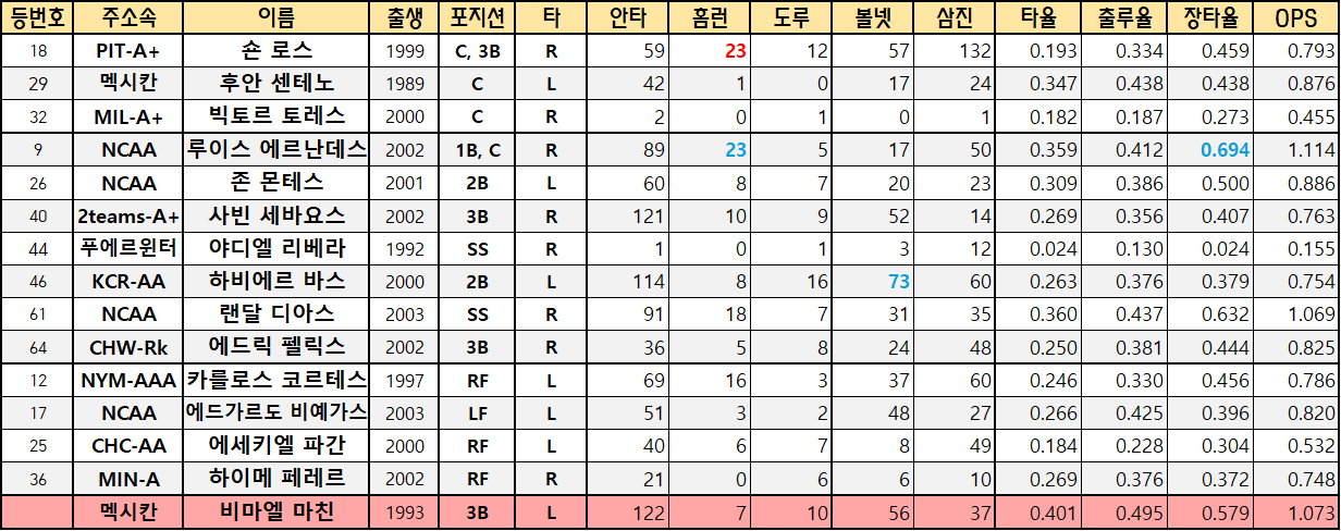 | 25 | CHC-AA | 에세키엘 파간 | 2000 | RF | L | 40 | 6 | 7 | 8 | 49 | 0.184 | 0.228 | 0.304 | 0.532 |