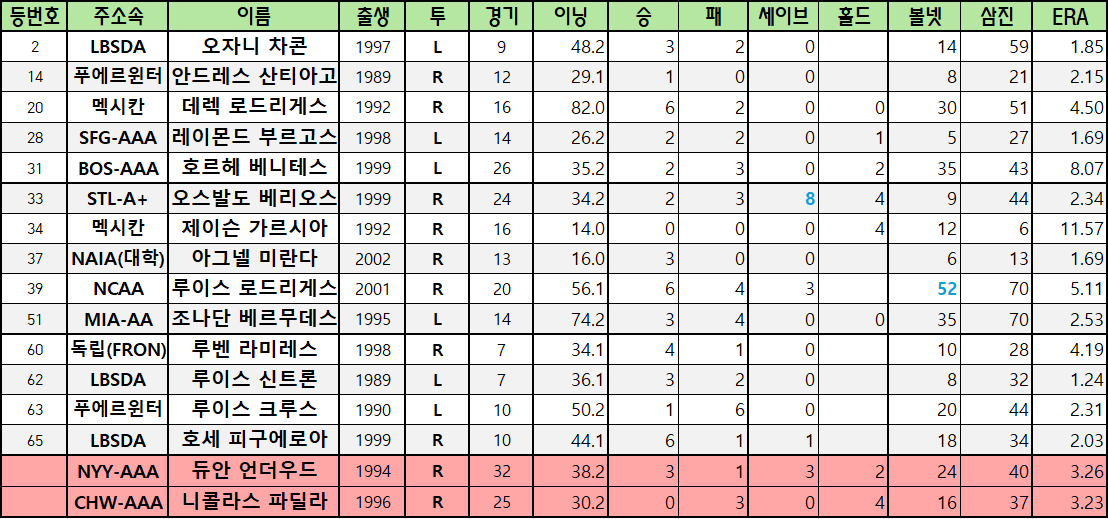 | 37 | NAIA(대학) | 아그넬 미란다 | 2002 | R | 13 | 16.0 | 3 | 0 | 0 | 6 | 13 | 1.69 | |