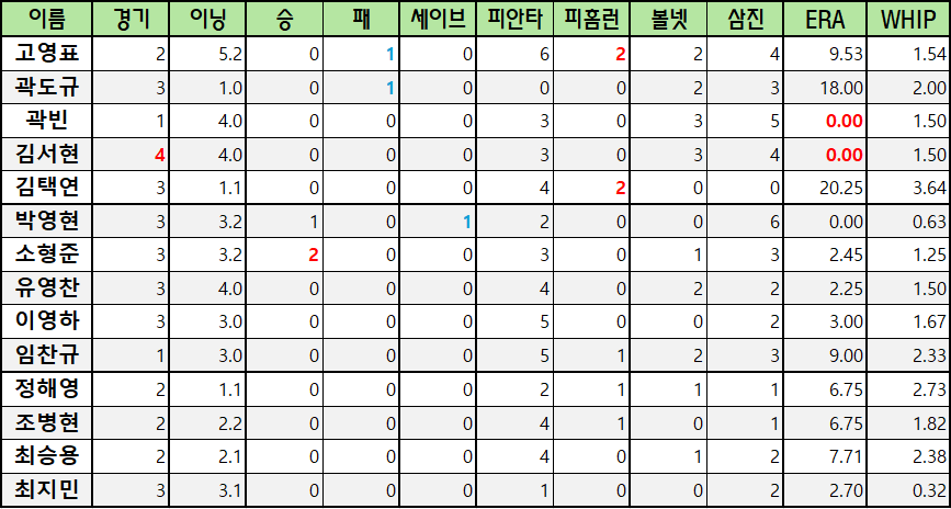 | 박영현 | 3 | 3.2 | 1 | 0 | 1 | 2 | 0 | 0 | 6 | 0.00 | 0.63 |
