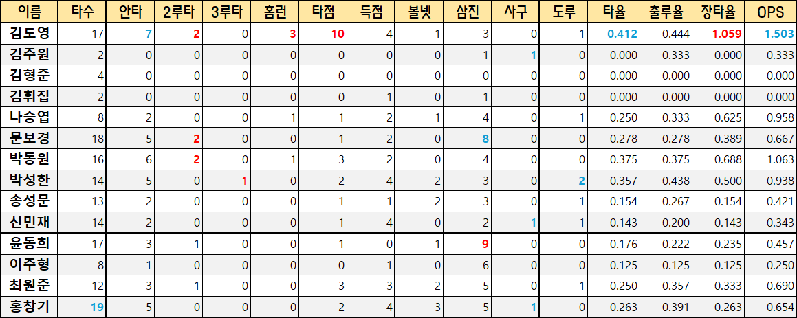 | 김도영 | 17 | 7 | 2 | 0 | 3 | 10 | 4 | 1 | 3 | 0 | 1 | 0.412 | 0.444 | 1.059 | 1.503 |