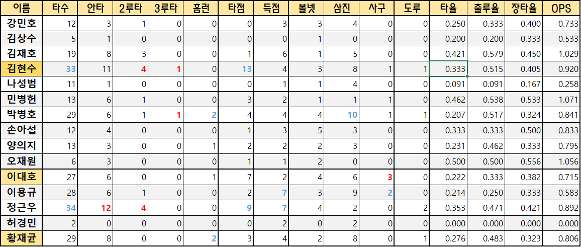 | 이름 | 타수 | 안타 | 2루타 | 3루타 | 홈런 | 타점 | 득점 | 볼넷 | 삼진 | 사구 | 도루 | 타율 | 출루율 | 장타율 | OPS |