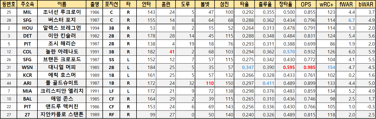 | 12 | COL | 놀란 아레나도 | 1991 | 3B | R | 182 | 41 | 2 | 68 | 103 | 0.294 | 0.362 | 0.570 | 0.932 | 126 | 6.0 | 5.9 |