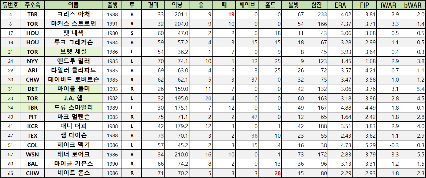 | 6 | TOR | 마커스 스트로먼 | 1991 | R | 32 | 204.0 | 9 | 10 | 0 | 0 | 54 | 166 | 4.37 | 3.71 | 3.3 | 1.4 |