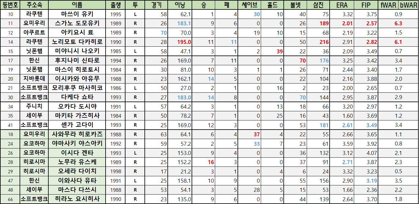 | 등번호 | 주소속 | 이름 | 출생 | 투 | 경기 | 이닝 | 승 | 패 | 세이브 | 홀드 | 볼넷 | 삼진 | ERA | FIP | fWAR | bWAR |