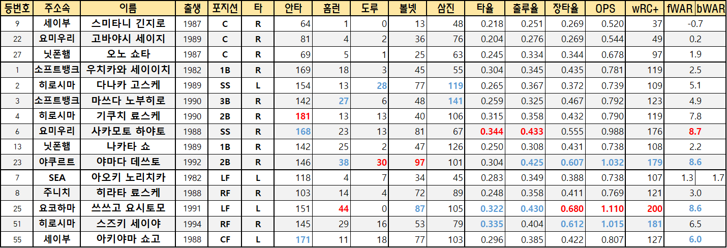 | 7 | SEA | 아오키 노리치카 | 1982 | LF | L | 118 | 4 | 7 | 34 | 45 | 0.283 | 0.349 | 0.388 | 0.738 | 107 | 1.3 | 1.7 |