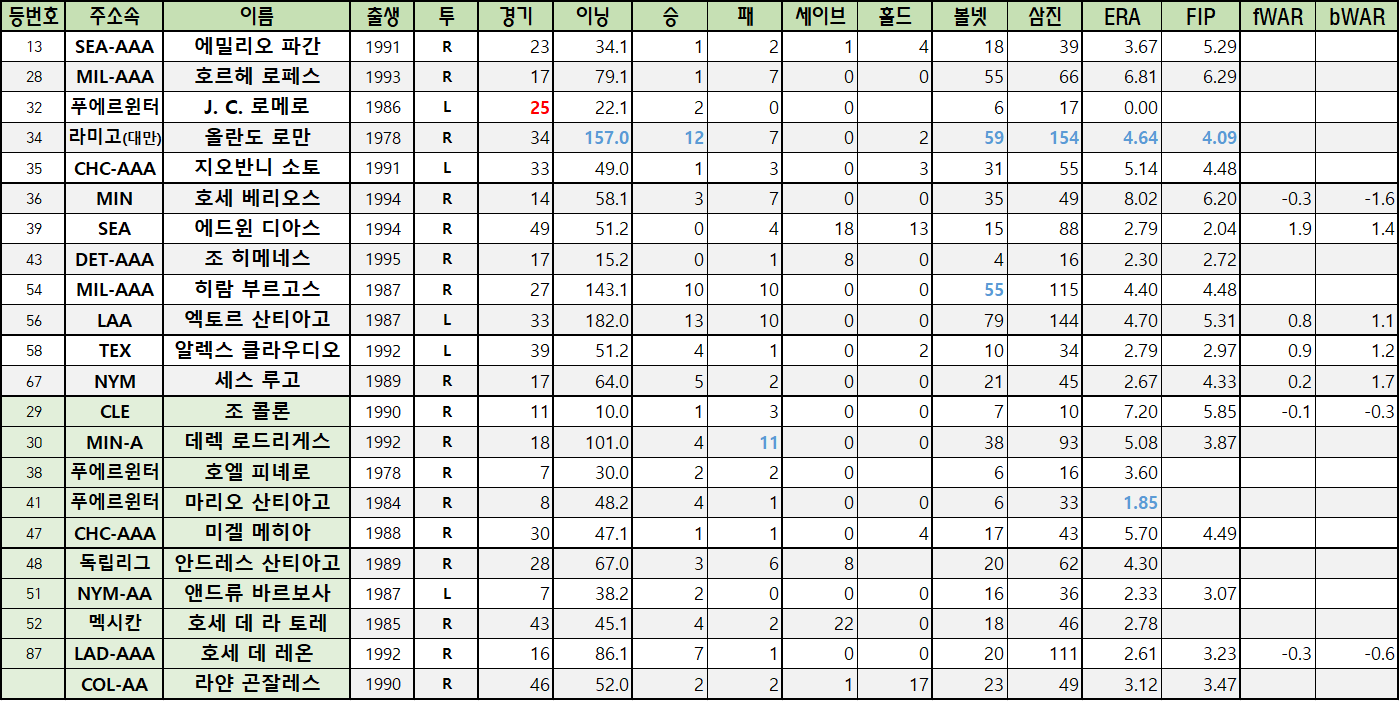 | 36 | MIN | 호세 베리오스 | 1994 | R | 14 | 58.1 | 3 | 7 | 0 | 0 | 35 | 49 | 8.02 | 6.20 | -0.3 | -1.6 |