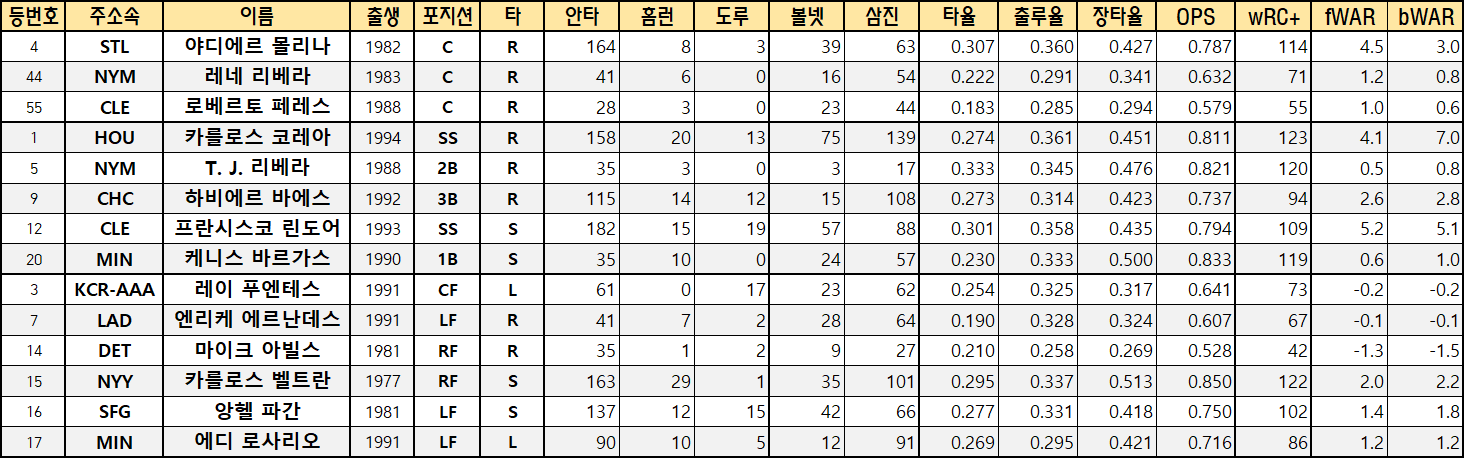 | 1 | HOU | 카를로스 코레아 | 1994 | SS | R | 158 | 20 | 13 | 75 | 139 | 0.274 | 0.361 | 0.451 | 0.811 | 123 | 4.1 | 7.0 |