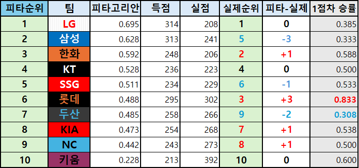 이번 시즌은 중위권의 게임차가 무척 적어, 피타고리안 승률 순위와 실제 순위의 차가 유독 많이 나네요.