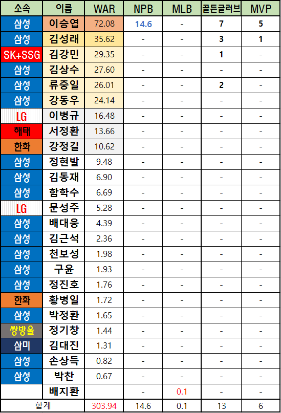 | 삼성 | 이승엽 | 72.08 | 14.6 | - | 7 | 5 |