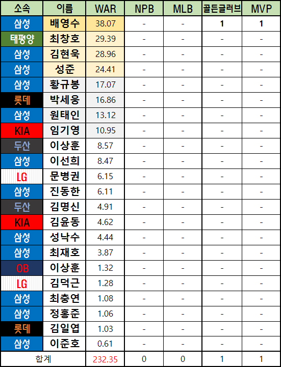 | 부산고등학교 출신 야구선수 WAR (~2023) (0) | 2022.08.18 |