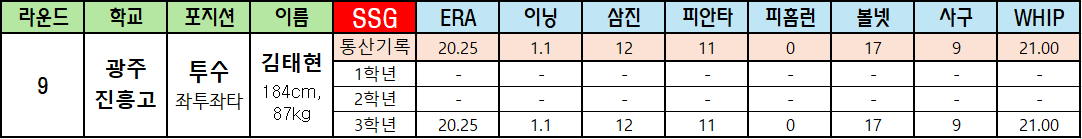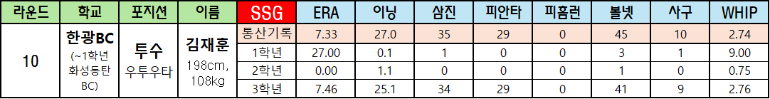 | 라운드 | 학교 | 포지션 | 이름 | SSG | ERA | 이닝 | 삼진 | 피안타 | 피홈런 | 볼넷 | 사구 | WHIP |