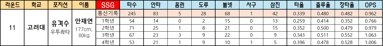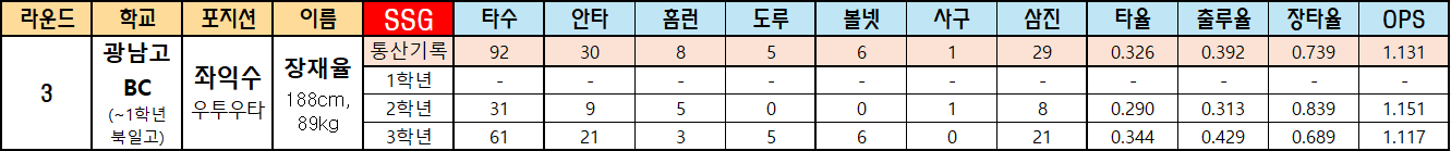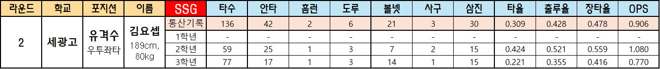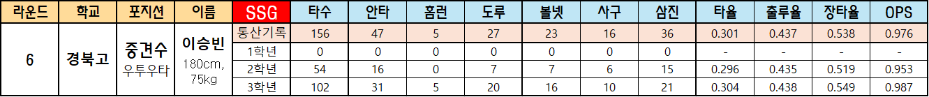 | 라운드 | 학교 | 포지션 | 이름 | SSG | 타수 | 안타 | 홈런 | 도루 | 볼넷 | 사구 | 삼진 | 타율 | 출루율 | 장타율 | OPS |