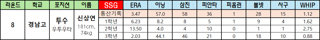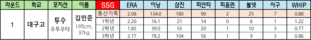 | 라운드 | 학교 | 포지션 | 이름 | SSG | ERA | 이닝 | 삼진 | 피안타 | 피홈런 | 볼넷 | 사구 | WHIP |