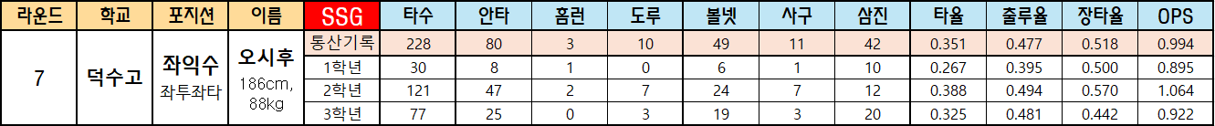 | 라운드 | 학교 | 포지션 | 이름 | SSG | 타수 | 안타 | 홈런 | 도루 | 볼넷 | 사구 | 삼진 | 타율 | 출루율 | 장타율 | OPS |