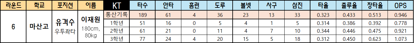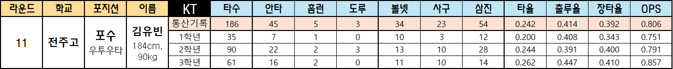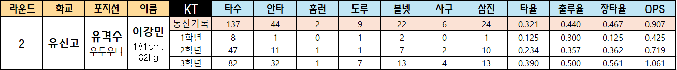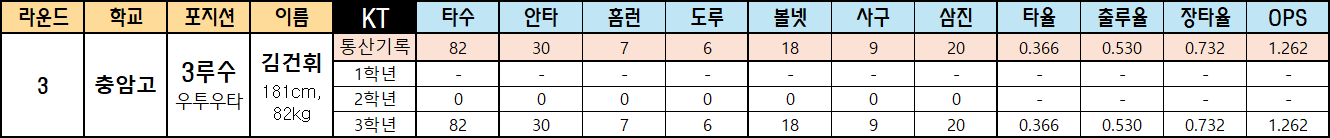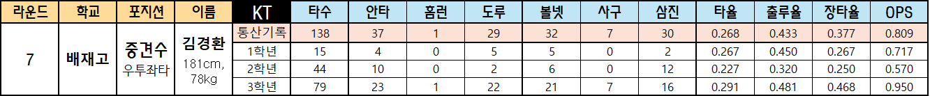 | 라운드 | 학교 | 포지션 | 이름 | KT | 타수 | 안타 | 홈런 | 도루 | 볼넷 | 사구 | 삼진 | 타율 | 출루율 | 장타율 | OPS |