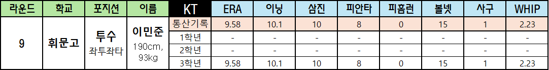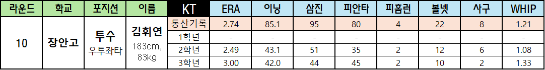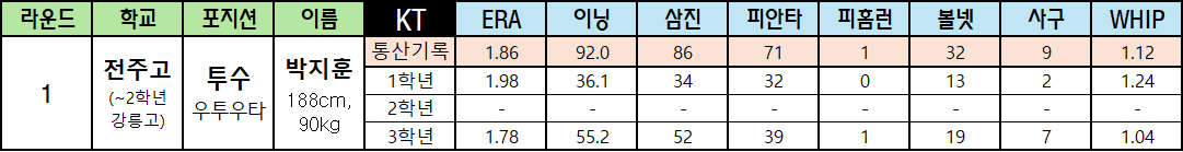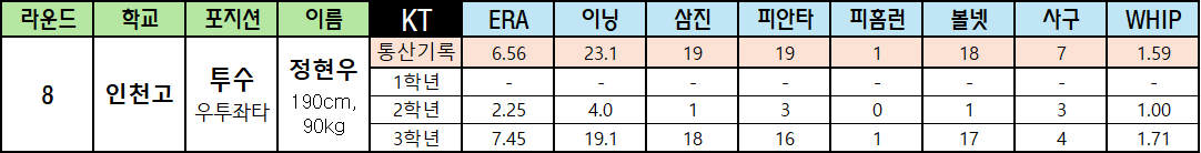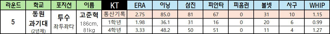 | 라운드 | 학교 | 포지션 | 이름 | KT | ERA | 이닝 | 삼진 | 피안타 | 피홈런 | 볼넷 | 사구 | WHIP |
