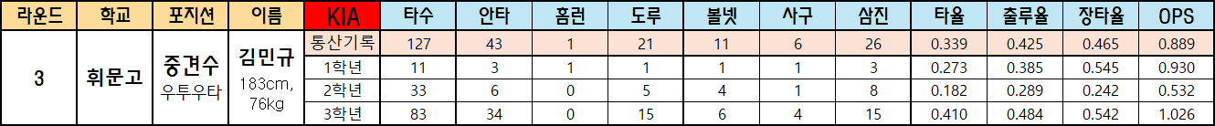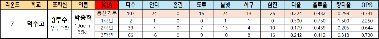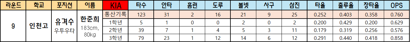 | 라운드 | 학교 | 포지션 | 이름 | KIA | 타수 | 안타 | 홈런 | 도루 | 볼넷 | 사구 | 삼진 | 타율 | 출루율 | 장타율 | OPS |